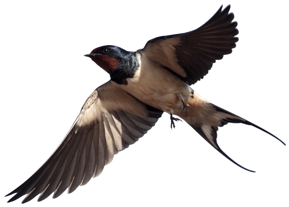Die Rauchschwalbe (Hirundo rustica) verdankt ihren Namen der Tatsache, dass sie früher oft Rauchfänge als Einflugsluken nutzte. Sie ist an ihren langen Schwanzspießen, dem tief gegabelten Schwanz und dem weißen Bauch zu erkennen. Kopf und Brust hingegen sind blauschwarz mit rostroter Stirn und Kehle.